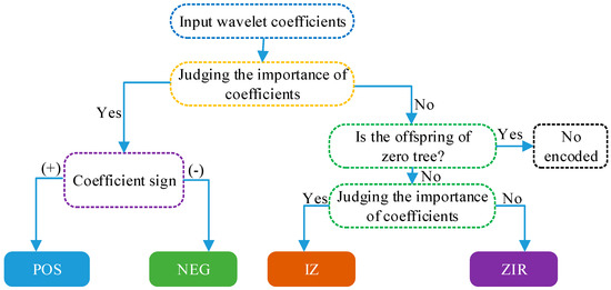 In this section, the zero tree structure, whose definition is that the root nodes and all offspring nodes are unimportant coefficients, we can use an encoding symbol to represent all coefficients in a zero tree, thus greatly improving coding efficiency. In the EZW encoding process, the wavelet coefficients are divided into four symbols by comparing with the threshold T, as shown in Figure 10.