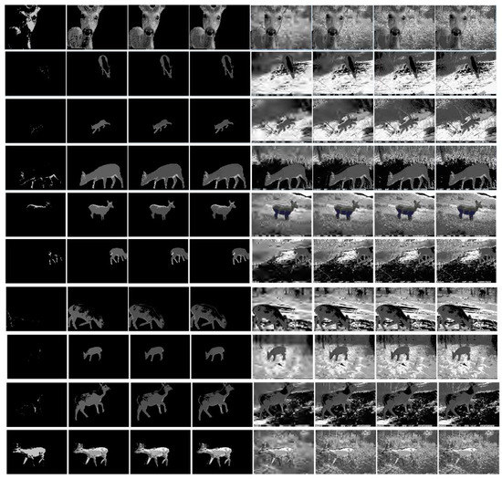As a proposed method, the saliency region is firstly transmitted through a lossless approach and then the background region in a lossy way [32], which are shown in Figure 11 by the first four and latter four columns separately. In the transmission process, we can quickly use the reconstructed image information to recognize the species of wildlife, such as the progressive transmission effect in columns 2–3. And we can also actively choose to terminate transmission after obtaining satisfactory information.
