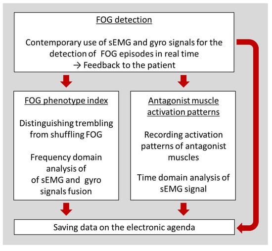 The real-time detection of FOG would allow timely alerting of patients or caregivers to implement recovery strategies. In Section 4, the frequency-domain processing of the sEMG and gyro signals fusion for distinguishing the trembling in place from the shuffling FOG is discussed and a FOG phenotype index is proposed. In Section 5, we present results regarding the type (contraction or stretching) and the intensity of the antagonist muscles activity during and outside FOG episodes obtained after sEMG signal processing.