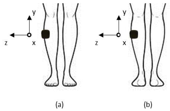 Sketch of the device positioning on: (a) the tibialis anterior; and (b) the gastrocnemius of the right leg. The axis orientation is reported.