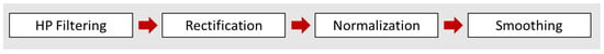 Following the literature [,,], we performed the conventional preprocessing resumed in Figure 4. In particular, the sEMG raw signal was high-pass (HP) filtered at 3 Hz to remove both the hum noise and the motion artifacts. It was rectified by calculating its absolute value. It was normalized to its maximum value. Finally, it was smoothed using low-pass (LP) filtering at 10 Hz to obtain the envelope. Hereafter, we address to the so-processed raw signal simply as sEMG signal.