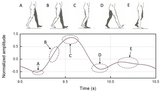 An example of the normalized angular velocity around the z-axis recorded on the TA in correspondence of the distinct phases of a single step: (A) toe-off; (B) initial swing; (C) mid-swing; (D) heel strike; and (E) mid-stance.