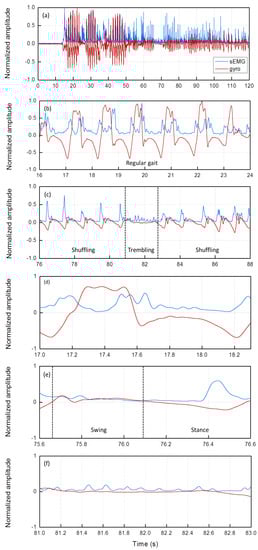 (a) An example of the sEMG (blue) and gyro (red) traces recorded on the TA; (b) zoom of the trace in a regular gait interval; (c) zoom of the trace in the FOG interval; (d) zoom of a single regular step; (e) zoom of a single shuffled step; and (f) zoom of step attempts during trembling FOG.