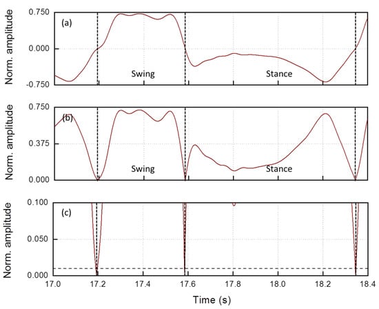 For the sake of clarity, in Figure 5, we report a typical gyro trace recorded during a single regular step, with the correspondence to the distinct step phases [] indicated. The gyro trace was low-pass filtered at 3 Hz to highlight the regular gait frequency content (0–3 Hz) [].