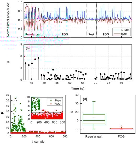 As one can see, we can define a demarcation level for R (R = 3), above which its values (black dots) correspond to regular steps and below which they correspond to FOG. It is worth noticing that the rest time interval is correctly recognized, so that R is not calculated at all in that interval (66–70 s). Figure 9b is a representation of an offline evaluation of FOG episodes occurrence. However, the algorithm displayed in Figure 7b runs continuously on the microcontroller embedded in the device and, as win is defined, R is calculated and compared with the demarcation level. Now, since, in the case of FOG, win is always in the order of 200 ms, we can likely affirm that the algorithm operates in real time.