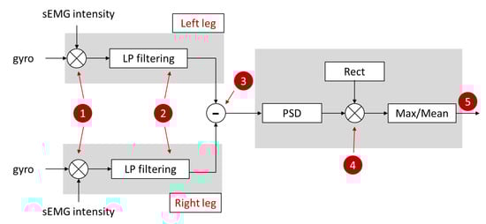 In this case, traces of the two legs need to be considered. A sketch of the algorithm blocks is reported in Figure 10. The first block (1) consists in calculating the product between the normalized sEMG and gyro traces during a FOG episode. The resulting product relative to a sample test is shown in Figure 11a for one leg experiencing first a shuffling and then a trembling in place FOG. The device was positioned on TA.