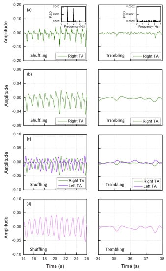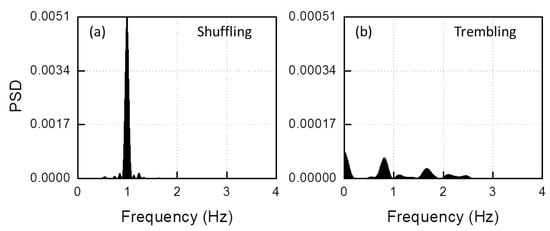 The result is shown in Figure 11d. Subtraction gives a sinusoidal curve only in the shuffling interval and a value randomly varying around zero in the trembling in place interval. The PSDs displayed in Figure 12 outline these features (again, in the trembling in place case, the PSD amplitude scale is 0.1×).