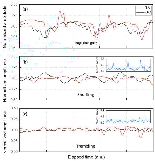 In Figure 6c, both the shuffling and trembling in place phenotypes are zoomed. The trembling in place interval is approximately 81–83 s. As one can see, traces during FOG are quite different from the regular gait, although only in the shuffling intervals a sort of periodicity is still appreciable.