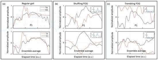 Zooms of specific portions of the traces are displayed in Figure 6b (during regular gait) and Figure 6c (during FOG). In the zoom of Figure 6b, we clearly see that, during the swing phase of each regular step, the sEMG trace is characterized by two maxima, whereas the angular velocity exhibits a single maximum, followed by a minimum during the toe-off phase.
