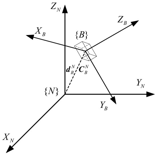where . ⊕ denotes a generic composition (quaternion products for the quaternion states and sums for other states). Note that is the angle error vector respecting to the three axes of body coordinates {B}. Since is very small, the rotation error of quaternion can be approximately expressed as . Correspondingly, the transition of the nominal state and error state has the following forms [32]: