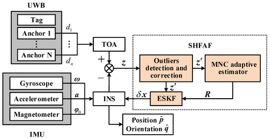 To solve these problems simultaneously, this paper proposes a Sage–Husa fuzzy adaptive filter (SHFAF) for INS/UWB integrated positioning. The error state is modeled for improving the system robustness instead of using the nominal state directly [32]. The IAE method is also considered, and the regulatory factor of the modified innovation contribution weight (ICW) is obtained through fuzzy inference system, so that the MNC can be estimated accurately in real time. Moreover, the sliding window estimation with fading coefficients is introduced to approximate the true innovation covariance. More importantly, it is applied to outliers detection and correction for providing precise positioning results based on the innovation orthogonality.