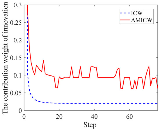 We define the adaptive modified innovation contribution weight (AMICW) as the product of regulatory factor and MICW (i.e., ), then the changes of ICW and AMICW are compared in Figure 3. It can be seen that AMICW always maintained a larger scale and can be adjusted adaptively according to the changes of external noise characteristics. In comparison, the value of ICW was very small and basically invariant after several iterations, which made little contribution to the estimate of .