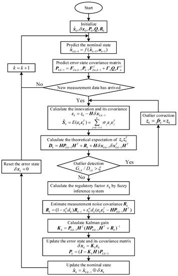 The flowchart of Sage–Husa fuzzy adaptive error state Kalman filter.