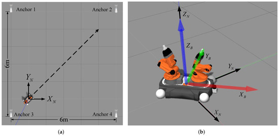 In simulations, the initial position of this robot is located at () in the navigation coordinates, it moves along the diagonal line of 4 m × 4 m square with constant speed 0.4 m/s. Note that there is a relative transformation between the initial body coordinates and the navigation coordinates, which can be seen in Figure 6b. As the robot moving on, IMU and UWB measurements are recorded and processed simultaneously. Meanwhile, several different positioning approaches are compared for performance evaluation.