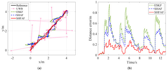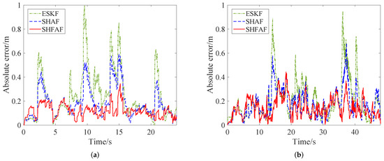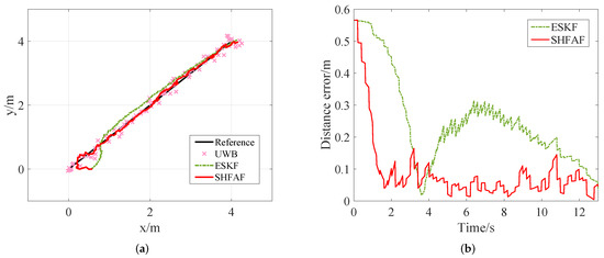 Simulation results for this scenario are show in Figure 7, where the absolute error is chosen as a measurable indicator for position accuracy. Figure 7a gives the estimated trajectories without considering outliers. Clearly, SHFAF outperforms ESKF because it has a stronger adaptive ability to the time-varying noise and its performance is not affected by the initial condition of MNC. This leads to poor positioning accuracy, and even worse than the results of UWB-only positioning at the initial stage. From Figure 7b we can see that the absolute positioning error of SHFAF is less than 0.2 m after 2 s, while ESKF needs about 10 s to achieve such an effect. It can be concluded that SHFAF has faster convergence speed and better self-adaptive ability than ESKF.
