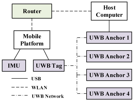 A large experimental site is obviously beneficial, so we make the robot cover space as large as possible under the limited experimental conditions. The configuration of the experimental site refers to [11,38], which is shown in Figure 10. The navigation coordinates is established in a rectangular area (i.e., 6.4 m × 4.8 m) which is surrounded by four UWB anchors. They are located at (), (), () and (), respectively. All anchors and tag work in the same frequency band and communicate with each other. The sampling frequency of IMU data is 50 Hz, and the update frequency of UWB positioning data is 5 Hz.