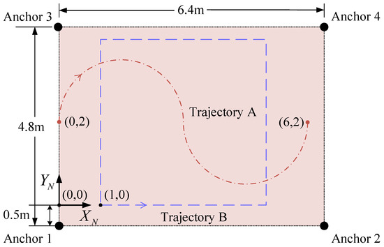 In a practical experiment, we designed two different motion trajectories to test our positioning approach (see Figure 11). In trajectory A, a robot started from point () and headed to the north. This trajectory was an S-shaped curve consisting of two semicircles with 1.5 m radius. The linear velocity was 0.405 m/s, and the angular velocity of the two semicircular trajectories was rad/s and 0.27 rad/s, respectively. Finally, the robot stopped at point (). Unlike trajectory A, trajectory B was a 4 m × 4 m square in which a robot moved around the edge of the square counterclockwise, i.e., it started at () and passed through (), (), and (). Finally, this robot returned to the starting point.