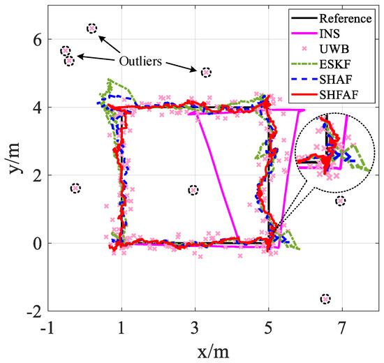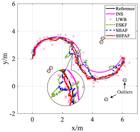 As shown in Figure 12 and Figure 13, the positioning results are not consistent with the reference trajectory in the case of existing outliers. This is because UWB measurements are affected by the multipath effects and NLOS factor. However, SHFAF has the best positioning performance among several contrast approaches, which can be shown in Figure 14. Clearly, the estimate of SHFAF is closer to the truth than that of ESKF and SHAF. ESKF is greatly affected by outliers and time-varying noise, leading to a large positioning error. Although SHAF has better positioning performance than ESKF, there are still large errors of position estimation (especially in positions with abnormal measurements). Note that the experimental results of integrated positioning approaches (i.e., ESKF, SHAF and SHFAF) are better than the individual approaches including INS and UWB. In addition, the performances of these integrated positioning approaches are consistent with the simulation results in Section 4.1.