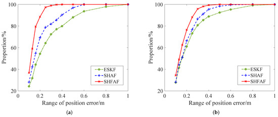 The absolute positioning error range of trajectory A and B are shown in Figure 15. The position estimation errors less than 0.2 m of SHFAF account for 88.6% of the total sampling points in Figure 15a, while SHAF and ESKF account for 69.3% and 54.3%, respectively. From Figure 15b, we can see that the positioning results of SHFAF, SHAF and ESKF with the error less than 0.2 m stand at 88.2%, 76.8% and 61.1%, respectively. It can be concluded that the error distribution of SHFAF is more concentrated than ESKF and SHAF in a small area of less than 0.2 m. In addition, the proposed integrated positioning approach can also estimate the attitude of the robot because of using the 6-DOF kinematic model. The estimated attitude angles in this experiment are shown in Figure 16.