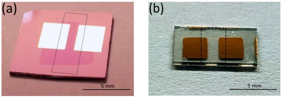 Photographs of gas sensor devices based on (a) PLD-functionalised CVD graphene on a Si/SiO2 substrate, and (b) epitaxial graphene on a SiC substrate. Gaps between the electrodes are 1 × 4 mm2 and 1 × 2 mm2 for CVD and epitaxial graphene, respectively. The CVD graphene sheet on top of electrodes appears as a darker pink area in (a) due to slightly different reflection properties. The areas of laser deposition of V2O5 are marked with dashed lines.