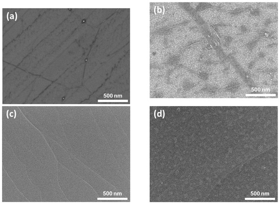 Scanning electron microscope (SEM) images are displayed in Figure 2 for CVD and epitaxial graphene surfaces before and after the PLD of V2O5. The features appearing darker in the SEM of CVD graphene (Figure 2a,b) are typical for transferred CVD graphene. It seems that graphene follows the uneven surface topography of polycrystalline Cu foil used in the synthesis; some of the details are possibly wrinkles formed during the graphene transfer. The surface of pristine epitaxial graphene sample in Figure 2c is typical for graphene grown on a nominally single crystalline, on-axis, 4H-SiC substrate. It is characterized by wide terraces, which are due to the step-bunching of the SiC substrate surface that occurs during the high temperature growth [20]. Laser deposited nanostructured material could be distinguished in the SEM pictures of CVD (Figure 2b) and epitaxial (Figure 2d) graphene samples as numerous irregular dots and patches.