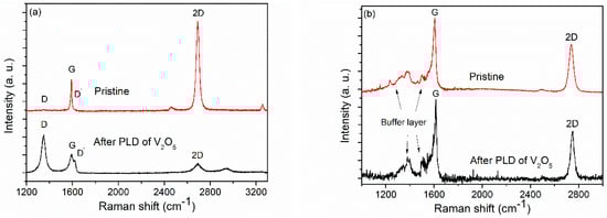 The laser ablation plasma species have a broad kinetic energy distribution. A noticeable portion of these particles may have energy sufficient for creating point defects as a result of removal of C atoms from the graphene lattice (20 to 100 eV) [28]. As a consequence of laser deposition of V2O5 onto CVD graphene, the Raman lines assignable to point defects or imperfect graphene edges emerged in the spectrum (Figure 3a). However, according to the Raman spectra depicted in Figure 3b, there were no noticeable defect related lines, and thus no considerable increase of defectiveness in the SiC/EG/V2O5 sample.