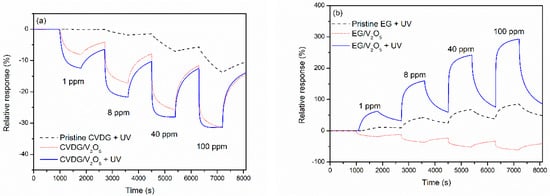 The results depicted in Figure 4 and Table 1 and Table 2 clearly show that, as compared to the pristine sensors, the response to NH3 was considerably improved after functionalisation using PLD. The relative response amplitudes to 8 ppm NH3, under UV light excitation, increased from 5 to 22%, and from 50 to 160% for CVDG and EG samples, respectively. Further, much faster characteristic response times were measured on both types of sensors (Table 1 lines 1 and 4, Table 2 lines 1 and 4), but the improvement of response and recovery dynamics was more drastic for the CVDG sensor. The increase of the gas response amplitude probably arose from increased density of energetically favourable adsorption sites or/and increased charge transfer between the graphene/V2O5 system and NH3 adsorbate molecules [15]. Such an improvement can arise from the strong adsorption ability of NH3 on V2O5 and possible redox reactions on the surface of V2O5 [36,37]. Similarly, fairly good NH3 gas sensing properties of semiconducting V2O5 thin films have been demonstrated by Huotari et al. [38].