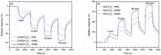 Influence of humidity content on gas responses of sensors based on V2O5 functionalised (a) CVD graphene on Si/SiO2, and (b) EG on SiC to varying NH3 concentrations at the room temperature. Permanent UV light was on during the measurements; the time intervals of gas exposure and recovery were 900 s.