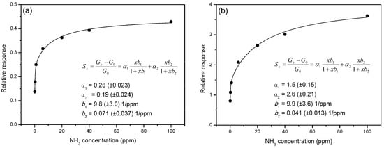 Dependence of stationary relative response amplitudes on NH3 concentration (black dots) for (a) CVD graphene and (b) epitaxial graphene sensors functionalised with V2O5. The continuous lines are fitting curves to two-site Langmuir adsorption model (Equation (2)). The coefficients of the modelled curves are also shown.