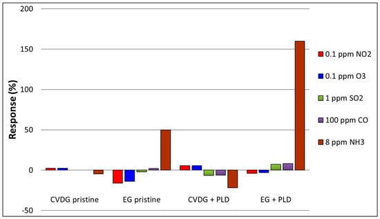 The responses of our CVD and epitaxial graphene sensor devices to several polluting gases are compared in Figure 7. We have already shown previously [15] that single layer CVD graphene functionalised with laser deposited V2O5 was considerably more selective to NH3 gas, rather than to NO2. PLD functionalisation of CVD graphene with Ag or ZrO2, in the contrary, resulted in a higher selective response towards NO2 gas [15]. The same tendency is also seen in Figure 7. Compared to the pristine sensors of both types of graphene, the response to NH3 gas increased considerably through functionalisation, and at the same time, the response to NO2 gas diminished, as in the case of EG, or increased only slightly, as in the case of CVDG.