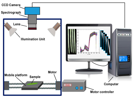 A line-scanning hyperspectral imaging system, as shown in Figure 1, in the spectral range of 375–1017 nm was used to acquire the hyperspectral images of wheat leaves. The system mainly consisted of a visible/infrared imaging spectrograph (ImSpector V10E, Spectral Imaging Ltd., Oulu, Finland), a high-performance 8-bit charged couple device (CCD) camera (OPCA05G, Hamamastu, Shizuoka Prefecture, Japan) coupled with a zoom lens (OLES23, Specim, Spectral Imaging Ltd. Oulu, Finland), an illumination unit equipped with four 100 W halogen lamps at angle of 45° (HSIA-LSTAIF, Zolix Instruments Co., Ltd., Beijing, China), a mobile platform (PSA200-11-X, Zolix Instruments Co., Ltd. Beijing, China), a camera obscurer, a stepper motor, and a computer with data acquisition software Spectra SENS (Spectral Imaging Ltd. Oulu, Finland). The hyperspectral imaging system was set up in the laboratory, with the room temperature of 28 ± 1 °C and relative humidity of 50%. Wheat leaves were placed on the mobile platform operated by the stepper motor at a speed of 14 mm/s. To obtain clear and undistorted hyperspectral images, the distance between sample and lens was 65 cm, and the exposure time was 5 ms during the image acquisition. Each image was acquired as a three-dimensional image (x, y, λ), which included 320 × 250 pixels in spatial dimension (x, y) and 256 spectral bands from 375 to 1017 nm.