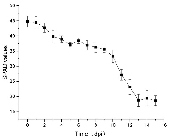 The SPAD value gradually decreased in the first nine days post-inoculation (dpi) of stripe rust. From day 10 to 13 after inoculation, the SPAD value decreased sharply, ranging from 33.71 to 18.76. This period represented the stage when symptoms first appeared in leaves; the leaves were obviously chlorotic, the tissue cells were destroyed, and the spores of stripe rust spread rapidly on the leaf surface. After 14 dpi, the leaves atrophied, curled, or even died, and the SPAD value changed very little.