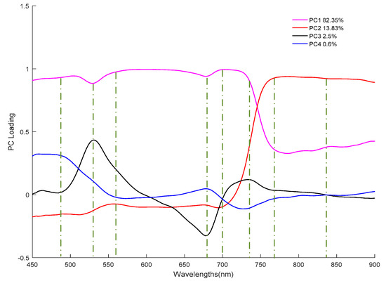In this study, PCA was employed to find multiple appropriate wavelengths at 450–900 nm that could simplify the model structure and improve model accuracy. From the calculation, the first four principal components (PCs), accounting for 82.35%, 13.83%, 2.5% and 0.6% of the total variance, respectively, were selected for further analysis, because more than 99.28% of variation was retained in first four PCs. Since each PC score is a linear combination by each spectral point multiplied by the corresponding loading, the wavelengths located at local maximal values (peaks) or minimal values (valleys) of the loadings curve have a more important contribution to the PC score [52]. Therefore, the loadings curves of the first four PCs, as shown in Figure 5, were subjected to selecting the effective wavebands. Loadings at local peaks and valleys can be regarded as characteristic loadings and the corresponding wavelengths were considered as key wavelengths for further regression models. Thus, eight effective wavelengths of 484, 530, 560, 680, 700, 738, 766, and 837 nm were preferably selected and indicated by a broken line. The number of selected dielectric variables was 3.12% of the 256 variables in the full spectra.