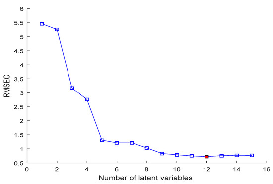 The characteristic variables selection process by SPA was implemented by comparing the root mean square error of calibration values (RMSEC) values under different variable numbers from 1 to 30. As shown in Figure 6, the RMSEC decreased rapidly when the number of wavelengths increased from 1 to 9, then decreased slowly to the minimum of 0.724, which correspond to the number of effective wavelengths of 12. Since more variables included in the model will decrease model calculation speed, when the RMSEC did not decrease significantly, the number of selected effective wavelengths was determined. The wavelengths selected finally by SPA are shown in Figure 7, which were 450, 462, 481, 523, 548, 690, 715, 740, 758, 850, 868, and 889 nm. The number of selected dielectric variables was 4.68% of the 256 variables in the full spectra.
