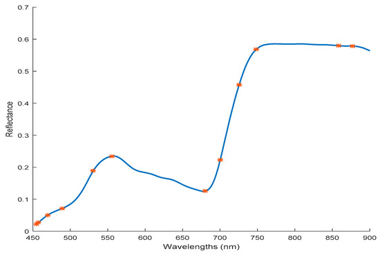 Figure 3 shows the spectral reflectance curve of healthy wheat leaves and wheat leaves infected by stripe rust at different days post-inoculation. The spectral curve conforms to the spectral characteristics of green plants [48,49], namely, the wave peak near 550 nm is associated with the strong reflection of chlorophyll, and the wave trough near 680 nm is due to the strong absorption of chlorophyll. The spectral reflectance rose sharply at 680–750 nm, generally referring to the “red edge” [50]. There are some differences in the reflectance spectra of wheat leaves with a different number of days post-inoculation. The reflectance of wheat leaves infected with stripe rust was higher than that of the healthy leaves, and the reflectance gradually increased with the increase of days post-inoculation, which was largely consistent with the result trend observed by Wang et al. [51]. Specifically, the distinct valley at 970 nm was an artifact of the spectral data acquisition process. In order to excluded this artefact and reduce the heavy noises at both ends of the spectral range, spectrum data below 450 nm and above 900 nm were discarded, leading to spectra within the range of 450–900 nm with 180 bands for further analysis.