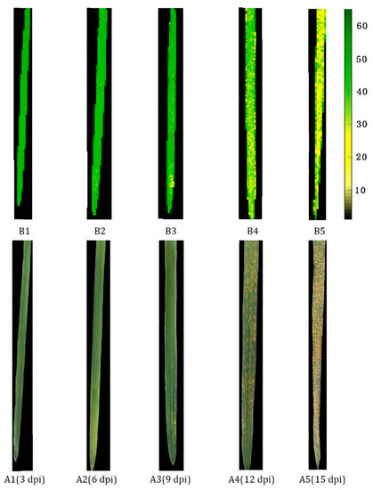 RGB images of the wheat leaves with five disease stages are shown in Figure 8 (A1–A5, from left to right, early incubation sample (3 dpi), mid-term incubation sample (6 dpi), late incubation sample (9 dpi), diseased sample (12 dpi), severe diseased sample (15 dpi)). No obvious symptoms appeared in early incubation period (Figure 8, A1) and mid-term incubation period (Figure 8, A2). With the increase of infection day, more and more yellow urediospores appeared on the wheat leaves (Figure 8, A3). The diseased leaves were visually covered by a mass of yellow-colored stripes (Figure 8, A4, A5). Therefore, it is difficult to diagnose the early infection of the fungus according to the RGB images until obvious symptoms appear.