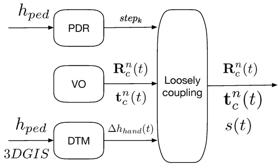 In this paper, we propose a novel approach for pose estimation with sensors held in hand based on monocular Visual Odometry and Pedestrian Dead-Reckoning. A human motion analysis from inertial data, i.e., a step length estimation, is used to dynamically solve the scale ambiguity and suppress the scale drift. The overview of the proposed method is illustrated in Figure 1. The proposed method can be divided into three main processes: “PDR” part, “VO” part and “Coupling” part. Since the “PDR” part and “VO” part are independent, our approach can be referred as a loosely coupled approach. The variables needed to develop the proposed method are all detailed in their corresponding following parts.