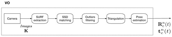 The “VO” part is dedicated to monocular VO for relative pose estimation based tracking. The origin of the camera frame is the optical center of the camera and the visual measurements are given in the Camera frame, labeled by c. In this part, because the scale estimation is independent of the image processing, any VO or vSLAM method can be applied if it outputs a complete pose estimate [23,39]. The implemented Visual Odometry framework is detailed in Section 3.2.