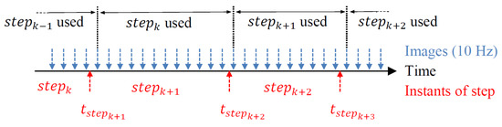 Because steps and images are not sampled at the same times, an interpolation is needed. Then using the knowledge of pedestrian step lengths and the frequencies of both the visual measurement and the pedestrian’s step, a linear interpolation is operated to determine the pedestrian displacement between the instants of two consecutive images, as illustrated in Figure 4. The scale of the VO during the step is computed by using the step length based on the interpolation.