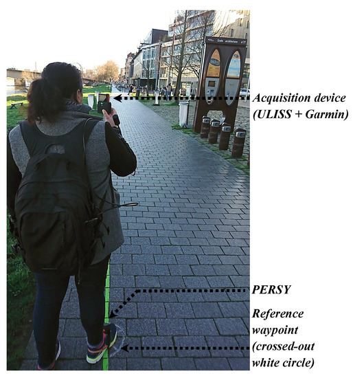 During acquisitions, pedestrians walked on absolute reference waypoints marked on the ground (i.e., with a crossed-out white circle) and made a stop of several seconds over them, as illustrated in Figure 7. Their locations were measured with a centimetric accuracy using a geodetic dual-frequency GNSS receiver (http://www.septentrio.com/) in differential mode. The starting and finishing positions of the acquisition were also determined using a differential GNSS solution.