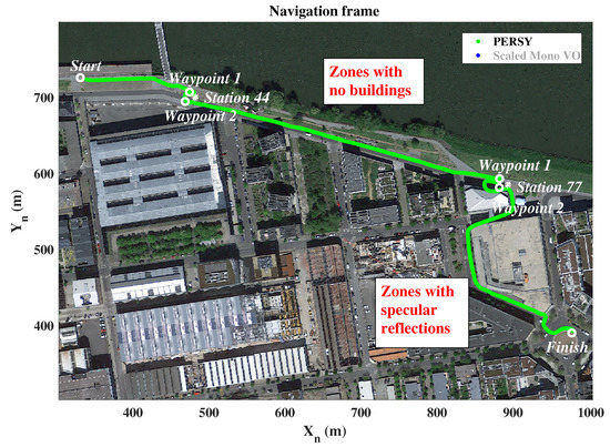 Figure 8 presents the relative PERSY reference track (in green) and the absolute reference waypoints (in white). Environmental specificities that may introduce difficulties in the monocular VO are also identified (in red).