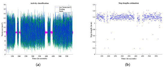 (a) Activities classification: Static (pink), Texting (green); (b) Step length estimation.