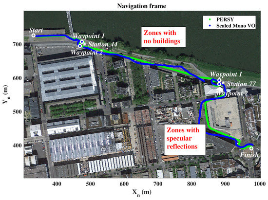 Monocular Visual Odometry is a frame-to-frame relative pose tracking approach using a camera for the incremental pose estimation [21,22,23]. In unknown environments, the camera pose is incrementally determined by, first, computing feature correspondences between two consecutive images, and then, computing the relative pose from the correspondences. However, one problem is to solve for scale ambiguity in the estimated poses [23]. The relative poses can fundamentally be estimated up-to-scale if known landmarks are used into the VO [8] or an initial translation of a camera is assumed to be known [24]. These approaches solve the initial scale estimation but still face the problem of scale drift that occurs in large displacements and degrades the localization accuracy [25]. As reported in [26], both direct and indirect VO approaches cannot avoid the scale drift when only a monocular camera is available, and the tracking errors are quickly accumulated over time. The drift can be punctually corrected by using appearance-based localization, using some known landmarks [3,27] or knowledge of existing 3D city models [28]. Ref. [29] presents a method for resolving the scale ambiguity and drift by using the slant distance obtained from a skyline matching between the camera and images synthesized using a 3D building model. The correction of the scale factor shows a 90% improvement of the positioning solution compared to a solution that does not correct the scale drift. These methods require to be located in an area where the 3D model is available and known with precision, whereas it is generally not. Loop closure, when revisiting the same place, is also used to correct the drift [25]. However, this approach is not applicable in the context of pedestrians navigating from point A to point B, without passing through the same place again.
