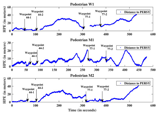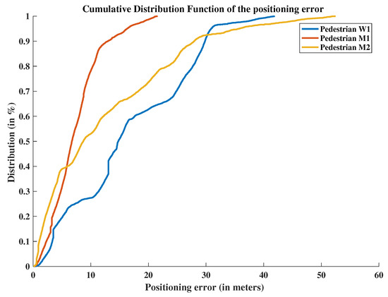 To assess the performance of the proposed approach, comparisons are made between the positions estimated with the scaled monocular VO and the relative PERSY reference tracks. Figure 11 presents the “Horizontal Positioning Error” and Figure 12 presents the “Cumulative Distribution Function” of the positioning errors for the three different pedestrians.