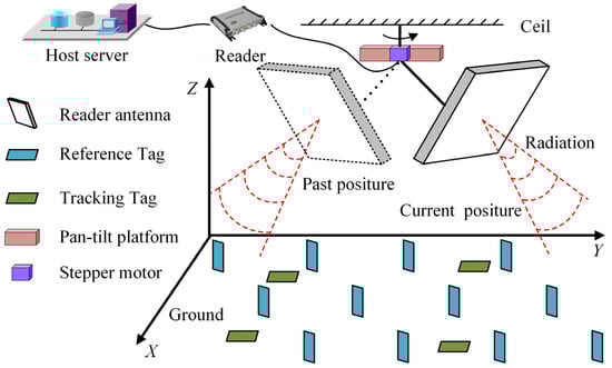 As shown in Figure 1, we consider a UHF RFID localization system performed under a directional radiation scenario. Four main parts constitute the system: a reader with an antenna mounted on a pan-tilt platform, a certain number of passive tags being tracked, a certain number of reference tags with known locations, and a host server for running a positioning algorithm. In accordance with reality, the directional patch antenna and the dipole antenna are chosen as the reader antenna and the tag antenna, respectively. Compared with the omnidirectional reader antenna, the directional patch antenna has a higher effective isotropic radiated power (EIRP) with <90 degree beam width, which is beneficial to increase the maximum interrogations range and alleviate the interrogation collision. A dipole tag antenna ensures that the signals from multiple propagation directions can be utilized for activating the wake-up circuit on the tag chip.