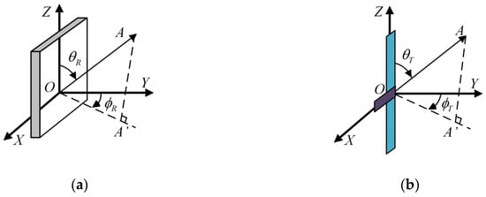 where the surface of the reader antenna lies on the XOZ plane, and the centroid is at , the pole of the coordinates system. Vector indicates the radiation direction of a certain beam of electromagnetic waves. is the angle from to . is the angle from to the projection of on the XOY plane. Similarly, establishing the radiation scenario illustrated in Figure 2b, the gain of a half-wavelength dipole tag antenna can be expressed as