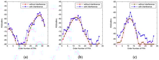 Secondly, OSFRA is introduced for selecting a superior RSSI measurement and NRT. As shown in Figure 4, due to the prominent radiation directivity of the reader antenna and equilibrium strategy, the trend of RSSI profiles with interference basically agree with those without interference. Here, the fixed rotation angle possessing the maximum of actual is defined as OSFRA, given by: