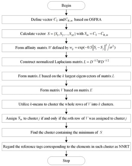 As the NNRT have been decided, classical kNN is utilized to estimate the position of the tracking tag, given by with . is the coordinate of the hth NNRT. where is the average RSSI measurement of the hth NNRT achieved on OSFRA. is the number of NNRT referring to the tracking tag assigned by our NJW-based method.