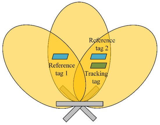 As shown in Figure 6, the shadow region in the middle represents the effective radiation area of OSFRA, and the shadow regions on both sides represent those of the adjacent rotation angles. Reference tag 1, Reference tag 2, and the tracking tag share the OSFRA. Also, the position of Reference tag 1 and Reference tag 2 are symmetrical within the middle shadow region. Here, the symmetric ambiguity problem can be depicted as follows. Since the two reference tags have the same theoretical RSSI value on , it is hard to decide which reference tag is a nearer NRT for the tracking tag by computing the distance between and , when we only use , , and to formulate measurement vectors. Undoubtedly, the introduction of and solves such a problem, since the two reference tags do not have the same theoretical RSSI values on and any longer.