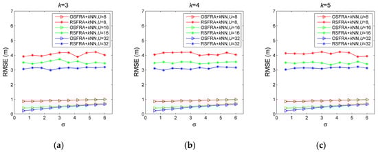 For verifying the effectiveness of OSFRA, the localization accuracy of OSFRA+kNN and RSFRA+kNN are compared. RSFRA, choosing the RSSI measurement with superiority and NRT by a random single FRA, is defined for comparison. kNN is utilized for position estimation. Figure 8 shows the RMSE comparison under various , U, and k. For one thing, for each set of , U, and k, it is obvious that OSFRA+kNN achieves a better performance, which proves the superiority of OSFRA. Take = 3, U = 16, and k = 5 for instance, the RMSE of OSFRA+kNN is 0.5261 m, while the corresponding value of RSFRA+kNN is 3.4748 m. For another, for the same set of U and k, the RMSE of OSFRA+kNN grows steadily as increases from 0.6 to 6, showing a good environmental adaptability. By contrast, the RMSE of RSFRA+kNN fluctuates greatly due to the uncertainty of the random FRA. Furthermore, for the same set of and k, the RMSE of OSFRA+kNN decreases as U increases from 8 to 32. Such increasing attributes to a set of NRT with more centralized deployment, benefiting from the shrink of the interval between two adjacent FRA from to . Also, it is conceivable that such accuracy increases will become very small once U reaches a critical value.